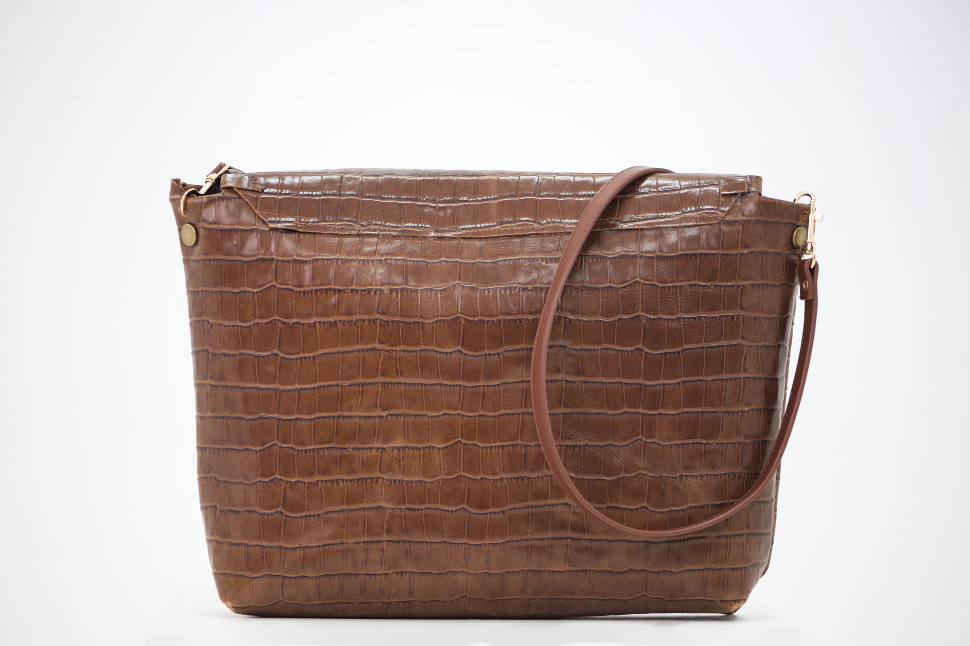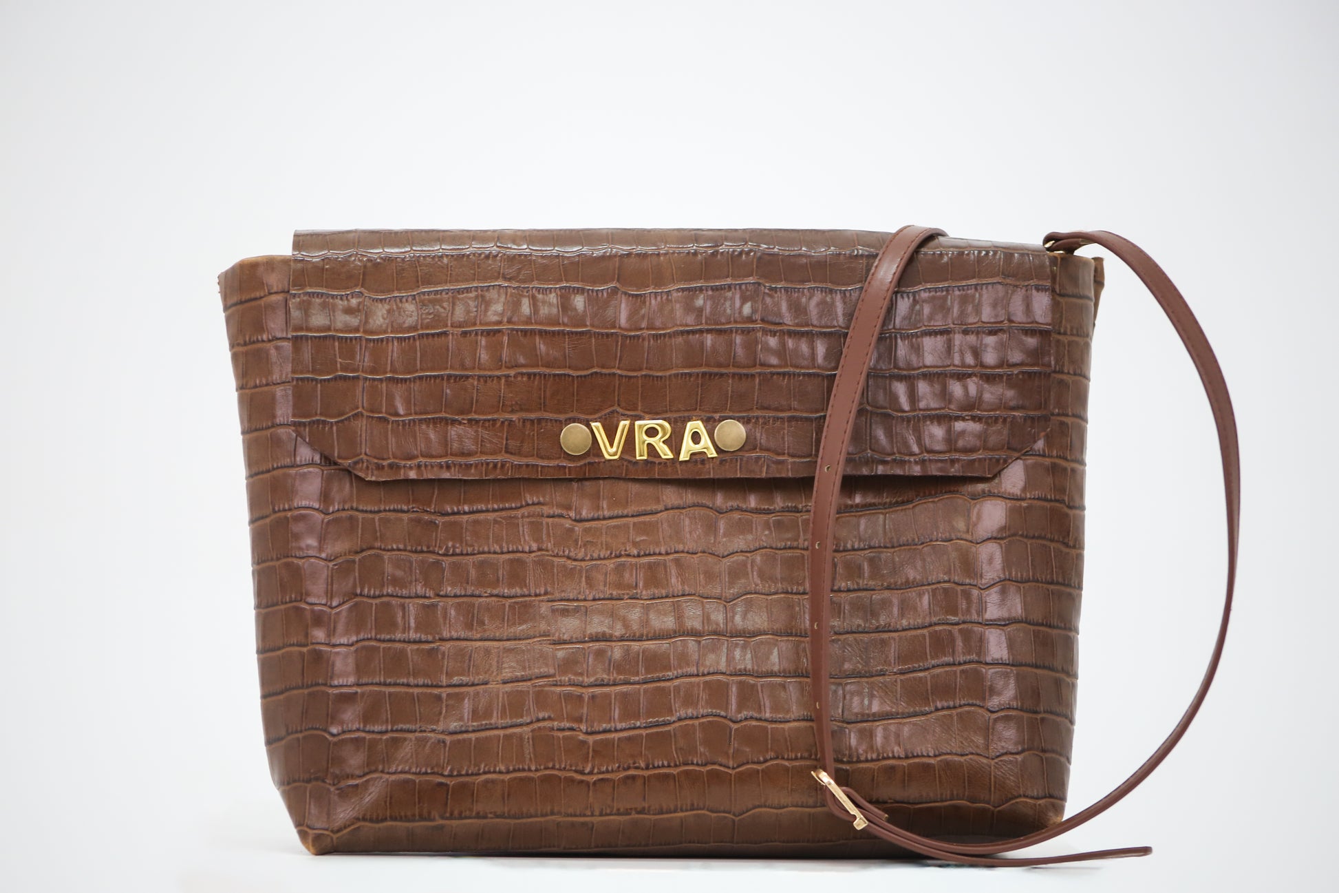 Bolso grande en piel de vaca con detalles en dorado.