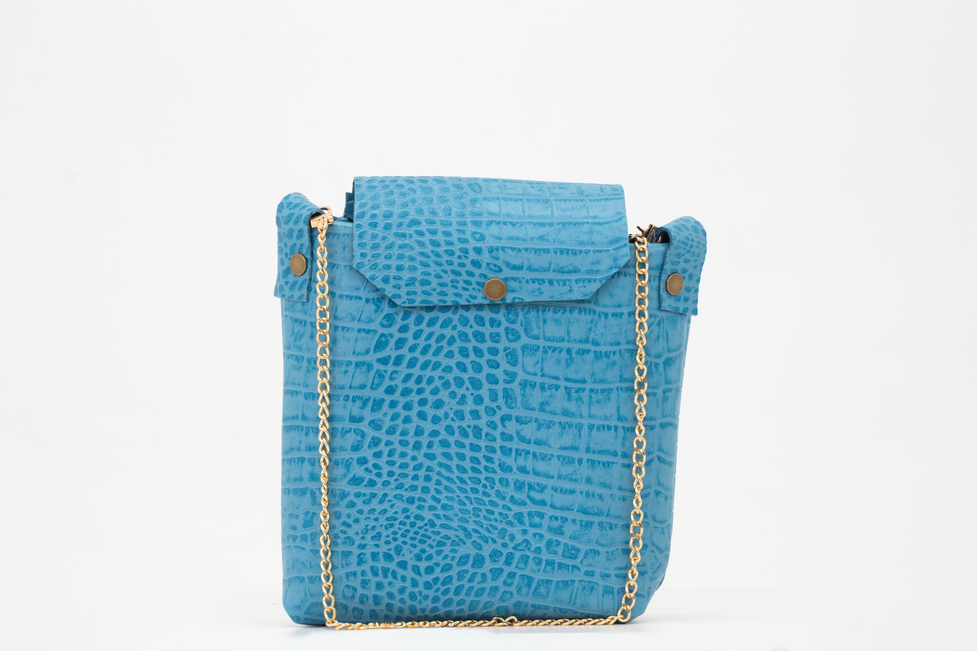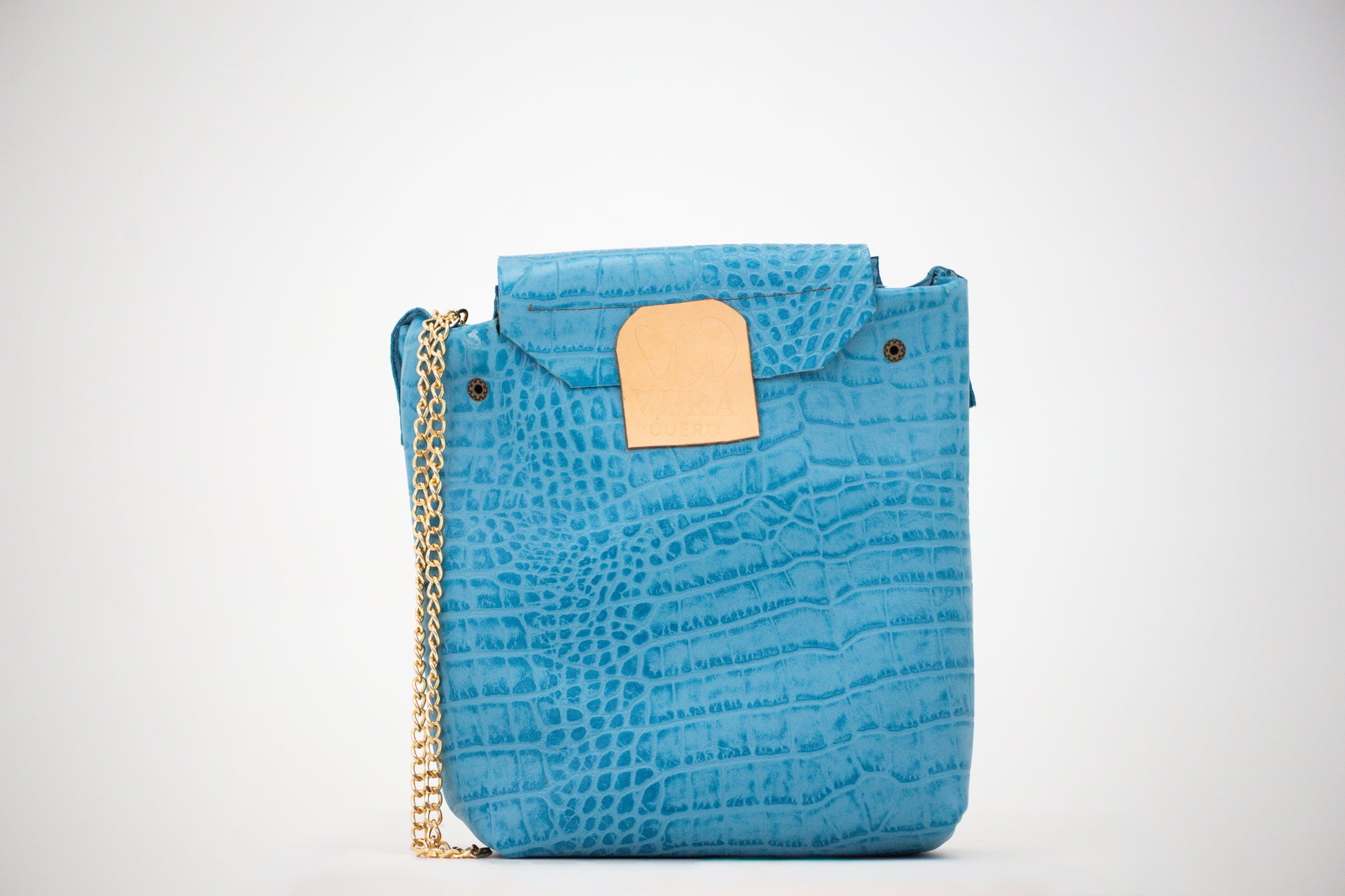 Bolso en piel de vaca símil cocodrilo con detalles en dorado.